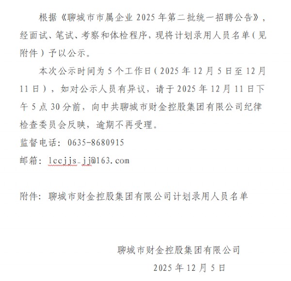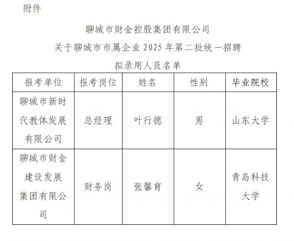 聊城市財金控股集團有限公司關于聊城市市屬企業(yè)2025年第二批統(tǒng)一招聘公告擬錄用人員公示